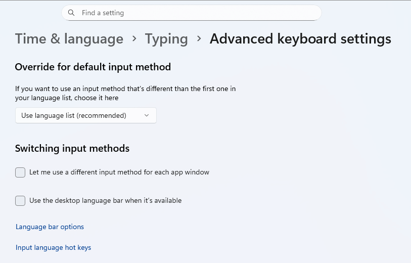 You can switch between the languages you have set up on Windows by a hotkey instead, typically set to Left Alt + Shift. This can be changed, but it’s hard to find where to do it: first, you must locate the advanced settings for Typing: