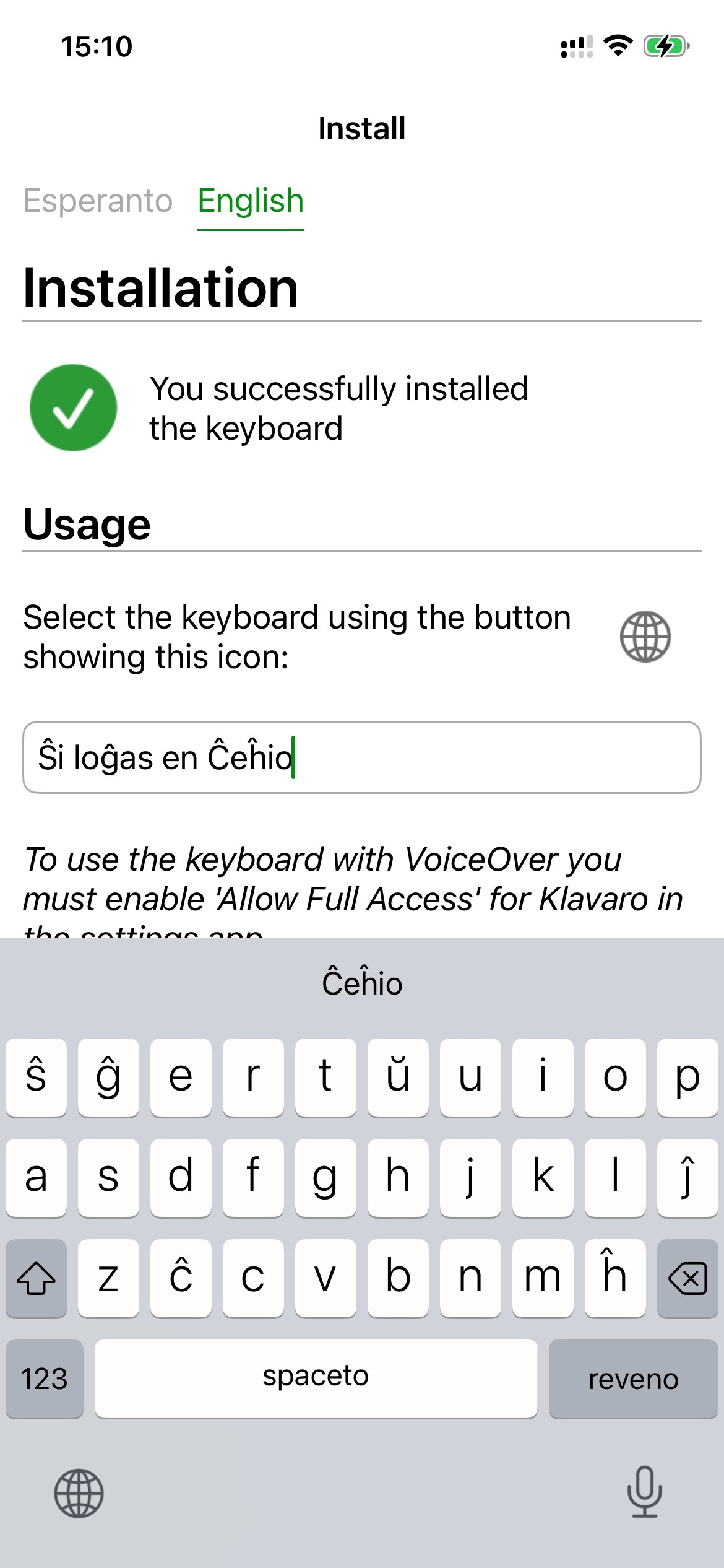 Esperanta Klavaro is available also on iOS, i.e., the iPhone, and there you’ll need to install it from the App Store, and then go to Settings/Keyboards to add it to the list of installed keyboards.