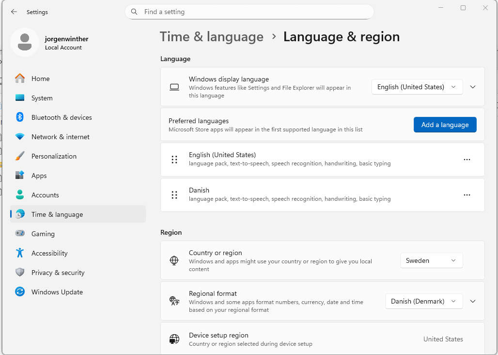 The setup then takes place in the Windows settings app, on the Language & region settings page: