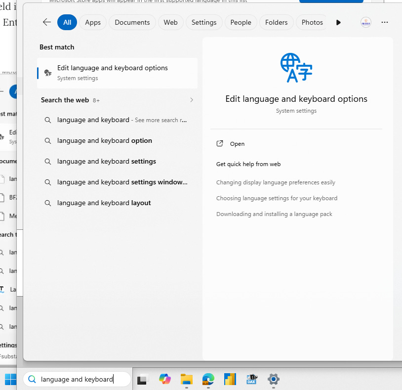 Hint: you can open those settings in different ways, but one is to use the search field in the taskbar at the bottom of the screen – type “language and keyboard”, press the Enter key, and you’ll get a link to the correct page: