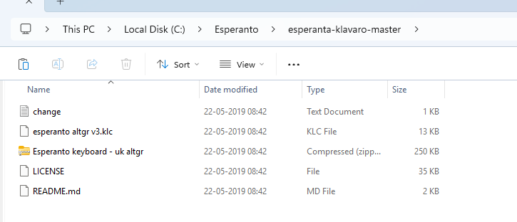For Windows, you can find a similar Esperanto Klavaro, also on a Github page, and here you’ll need to get the files, then go to the settings page and define Esperanto as the language of the computer. This works differently on different Windows versions, but on Windows 11, you’ll start by downloading the files from Github and putting them on your computer, in a place where you can find them, for instance like this: